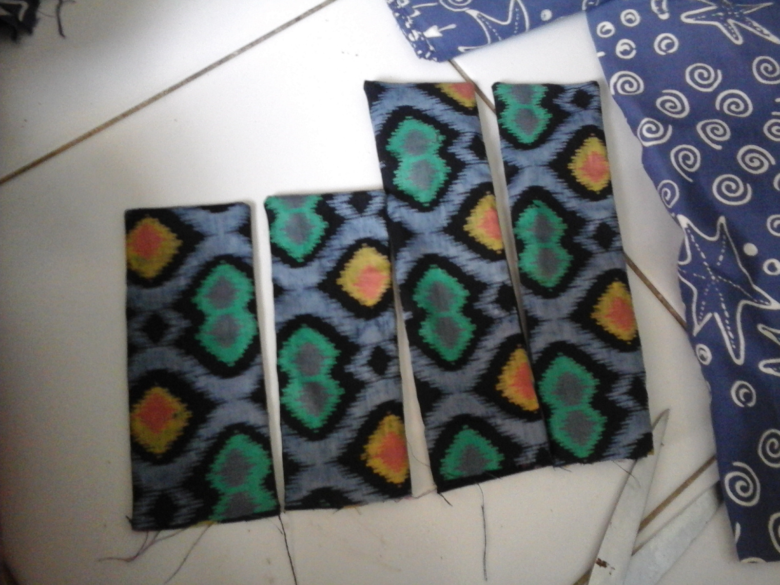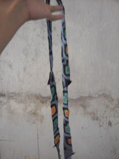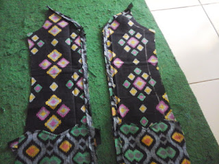 Gambar asessoris tangan bisa dilihat di foto berikut. Saya membuat dua persegi panjang, yang satu panjang dan pasangannya pendek. Saya membuat dua pasang karena akan saya gunakan untuk lengan kanan dan lengan kiri. Jangan lupa lapisi dua pasang kain persegi panjang tersebut dengan kain sisa yang panjang dan lebarnya sama dengan asessoris tersebut. Jahit ketiga sisinya. Sisakan satu sisi (salah satu sisi lebarnya) untuk lubang.Sentik balik asessoris tangan tersebut. Jangan lupa tekan di bagian ujungnya agar lancip.