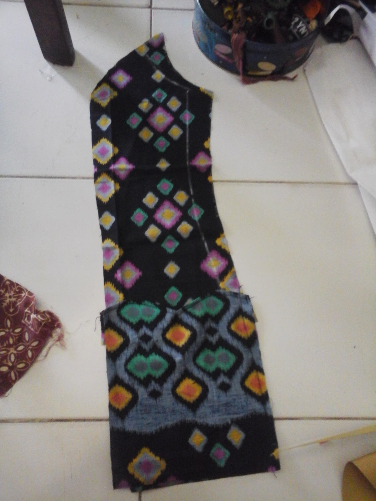 Gunting pola kerah yang sudah jadi.Hasilnya seperti ini. Saya buat terpisah karena kebetulan posisi kerah di kain kerah mengharuskan bagian terpisah. Untuk pemula, lebih baik bagian tengahnya menyambung.