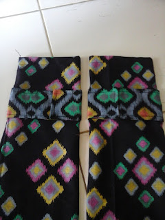 Setelah siap, kita pasangkan asessoris lengan di bagian lengan, bisa dilihat di foto berikut. Kain yang panjang ditumpuk / diletakkan di atas kain yang pendek.
