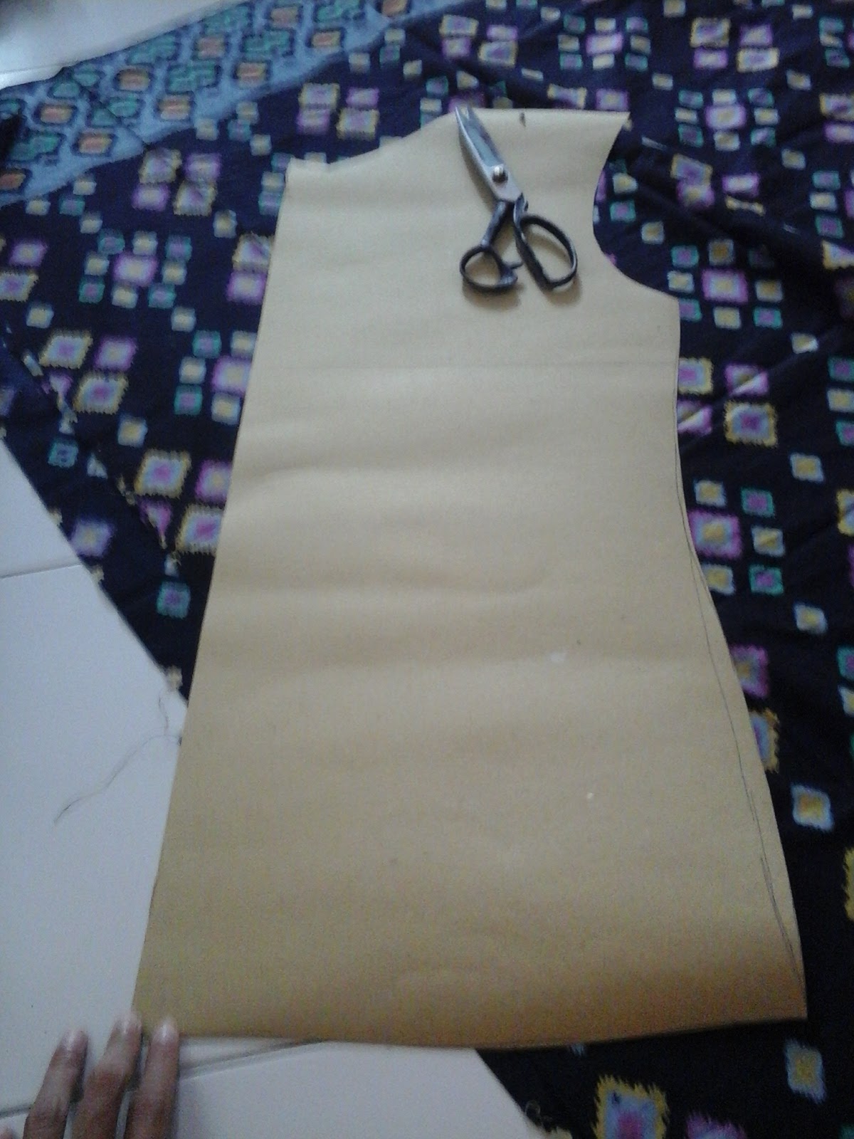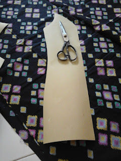 Gambar polanya di atas kain keras. Untuk model ini saya membuat kerah lancip. Panjang kerah menyesuaikan lingkar leher. Untuk lebar kerah bagian lancipnya kira-kira 10 cm, sedangkan bagian tengahnya kira-kira 7 cm.