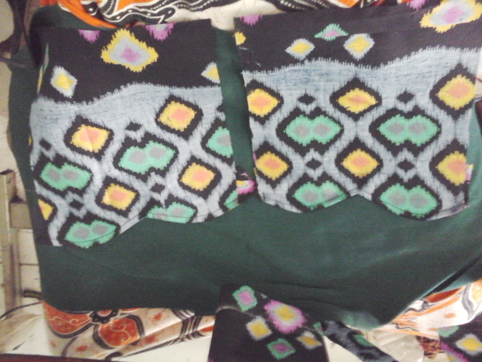Setelah saku diletakkan dan dijahit. Jangan lupa jahit bisband di bagian lengkung atas hingga ke bawah. Hasilnya seperti ini.