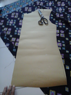Jangan lupa pola bagian dada hingga ke bawah di gambar di kain tersebut. Jangan lupa juga di lebihkan 1 cm untuk jahitan. Sedangkan bagian bawah dilebihkan 2-3cm.