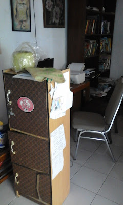 Lemari kecil dipindah ke ruang tamu untuk sementara.