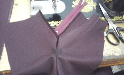 Kita siapkan resletingnya dan bagian rok bagian belakang. Beri tanda di bagian bawah. Tanda ini tidak boleh melebihi besi bawah resleting.